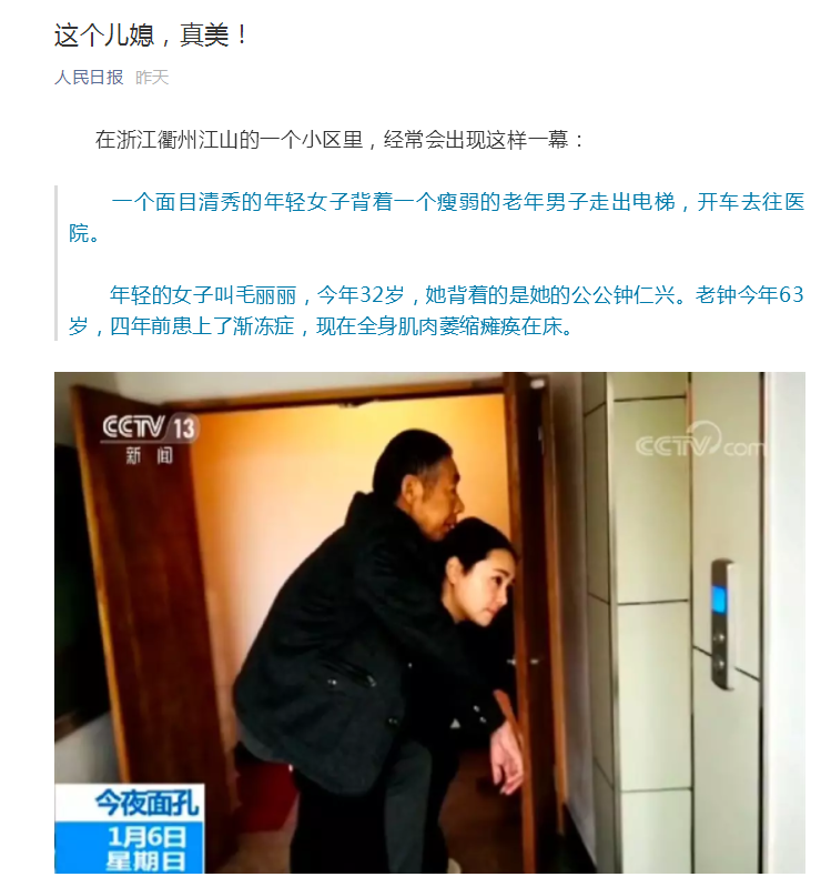 “今天的面孔是從一張照片開始的。春瀟,你覺得他倆什么關系?”“要是第一眼看呢,我首先會猜是女兒在背爸爸?!?月6日晚,CCTV新聞頻道《24小時》欄目中的“今夜面孔”部分,以《“最美兒媳”毛麗麗:背起公公 扛起家》為標題,報道了江山市32歲的兒媳婦毛麗麗悉心照料63歲患有漸凍癥的公公一事,時長15分22秒。