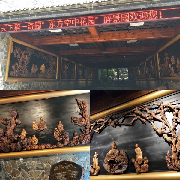 臺階上來之后就是生肖文化長廊,它用根雕藝術展示中國民俗文化之一的生肖文化,既有文字說明介紹,也有根雕的十二生肖造型。