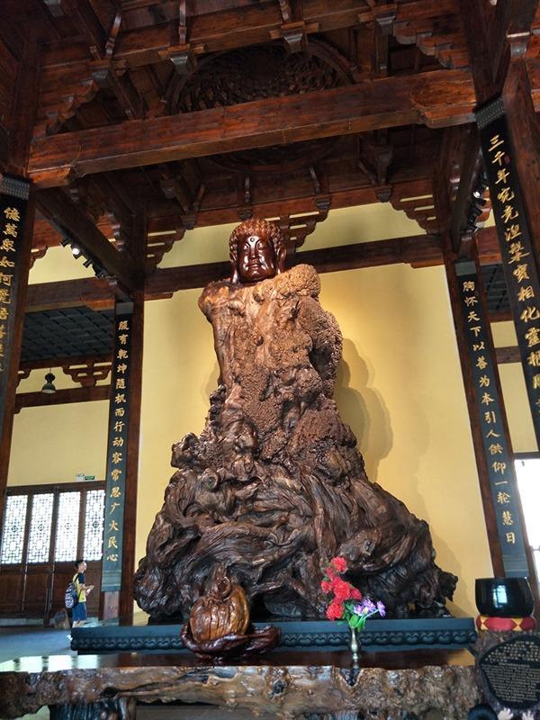 進入大雄寶殿,就能看到最著名的擺在正中位置的釋迦牟尼主佛,木質為黃心楠,高9.9米,重達40余噸,是根雕佛國里最大的一尊佛像。根材形體龐大,造型奇絕,十分稀有?!?nbsp;