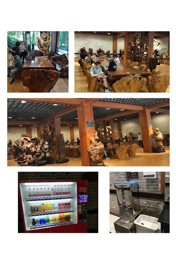 休息片刻后,我又順著右邊的石階攀登而上,發現一個更適合休息的醉景樓游客體驗館內,竟然可以坐在根雕藝術品上休息!如果有帶自己的水杯,甚至可以去指定地點接熱水喝,當然館內也有自動販賣機,很是方便。