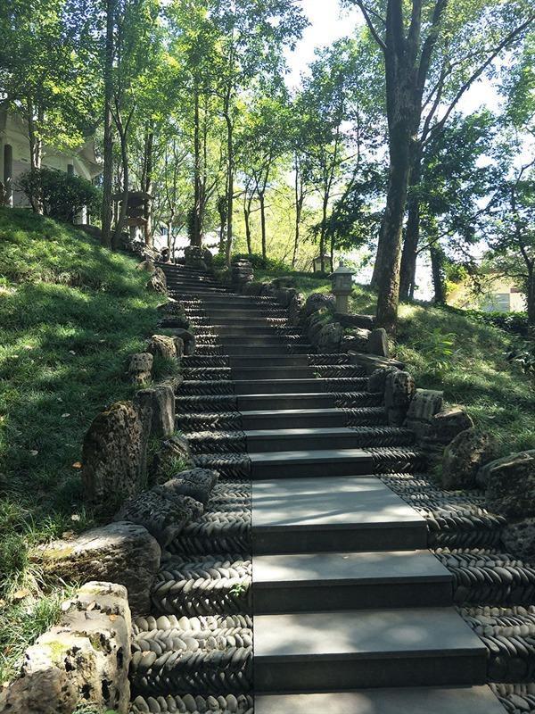 欣賞完八卦圖及福門祥光后向右轉,漫步在石階上,一縷縷金黃色的陽光從密密層層的枝葉間投射下來,地上印滿了大大小小的粼粼光斑,美麗極了。園內每個景點都有指示牌,還有保安和服務人員的溫馨提示,所以根本不用擔心迷路。