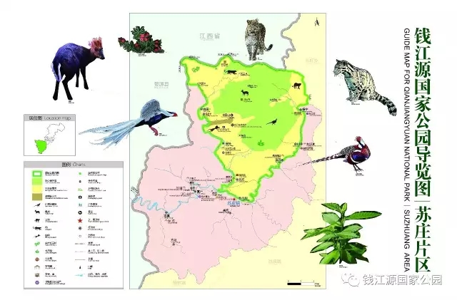 錢江源國家公園(蘇莊片區)位于錢江源國家公園南部,與江西婺源森林鳥類國家級自然保護區毗鄰、轄橫中、余村、唐頭、溪西、毛坦、蘇莊、古田7個行政村,22個自然村。片區內分布著典型的低海拔中亞熱帶常綠闊葉林,是保存生物物種的天然基因庫。有紅豆杉等國家一級重點保護植物、香果樹等14種國家二級重點保護植物;是中國特有的世界珍稀瀕危物種、國家一級保護動物白頸長尾雉、云豹、豹、黑麂主要棲息地,也是國家二級保護動物白鷴、黑熊等動物的的主要棲息地。片區內人文資源豐富,蘇莊草龍已經列入國家級非物質文化遺產名錄,保苗節、古佛節、跳馬燈、滿山唱等列入省級非遺;還有“凌云寺”、“點將臺”等名勝古跡,“姜家祠”、“宋朝窯址”、“元杉”、“唐柏”、“吳越古樟”、“蘇莊銀杏”等重點文物保護單位及古樹名木。