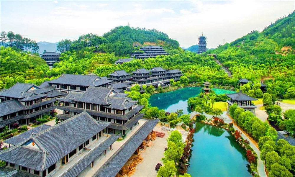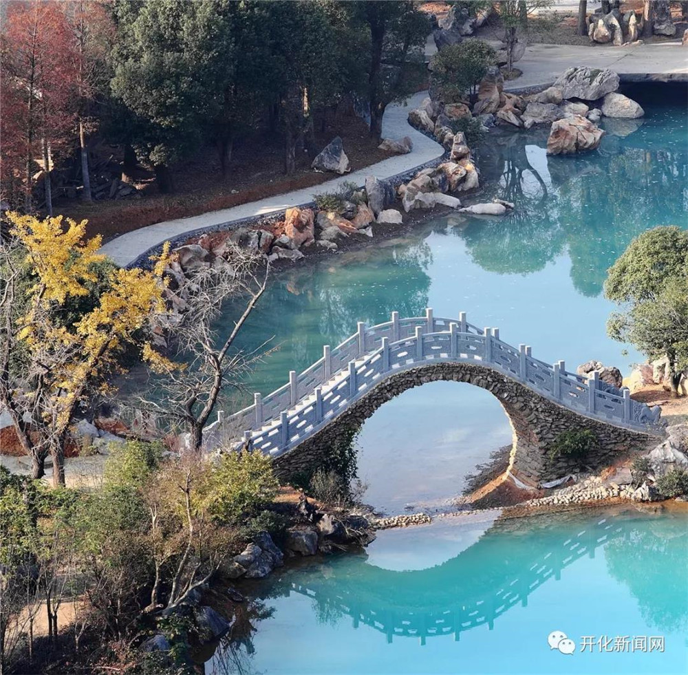 在開化縣根宮佛國三期——華夏根文化景區的長階上,能看見兩處顏色特別的水域。以佛國廊橋為界,西側是一個藍如寶石的圓形“湖泊”,東側的水域則碧如翡翠,兩片水域高低相連,呈現出顏色由藍變綠的奇觀。