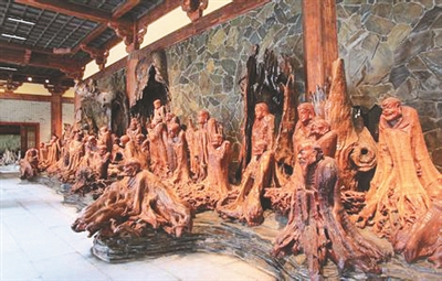 然而,大出意料,這個根宮佛國不僅讓我吃驚,還讓我歡喜了一路。那里的展品數量之多,叫人望而生畏,室內室外足有數千件;體量之大讓人咋舌,幾噸、十幾噸、幾十噸的作品都有。聽介紹,有的巨作不得不先露天雕刻,創作完成后再加頂修展廳;藝術品位之高讓人難以想象,用樹根做藝術創作的材料,無論材質還是形狀都有天然的局限性,竟然不僅能完成獨立的如彌勒、觀世音、如來、韋陀的創作,還能完成“四大天王”“十八羅漢”“五百羅漢”的集體群像,每個形象個性分明,栩栩如生,且個個大小勻稱,渾然一體。