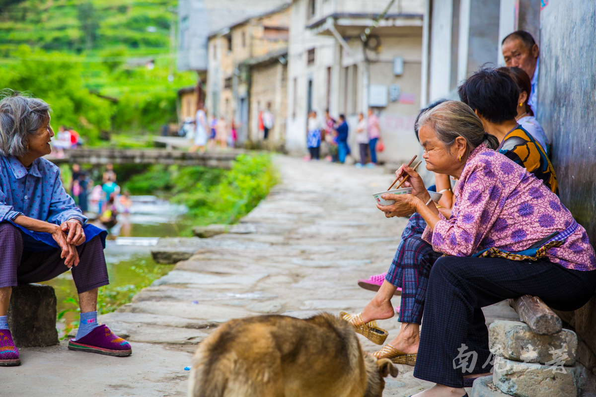 年輕人大都外出打拼了,留守的老人們并沒有挖山墾荒,除了適時耕種培育,利用自然資源優勢辦起了簡易農家樂。老人們喜歡端著飯碗坐在街邊吃飯,時光悠悠。