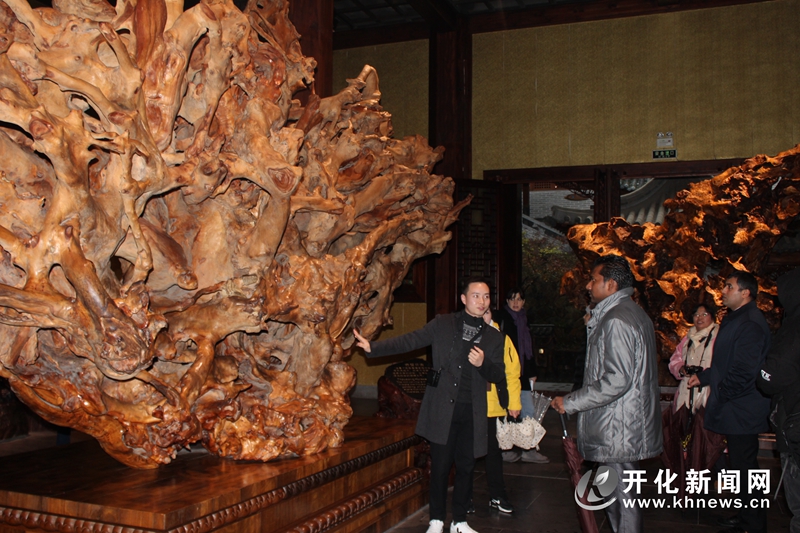 “amazing!”12月15日,駐華(外)大使一行參觀考察根宮佛國景區,并參觀了“根據地”伴手禮商店和根雕創作大賽。面對栩栩如生的根雕作品和園林古建風光,大使們發出陣陣驚嘆。大使團成員來自巴哈馬、斯里蘭卡、克羅地亞、塔吉克斯坦等國。
