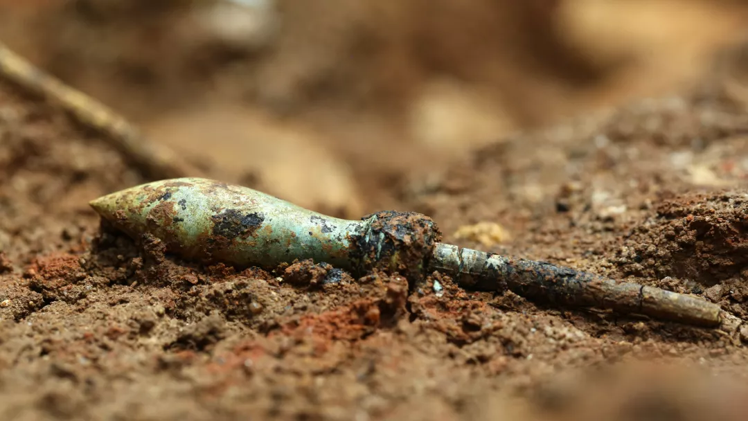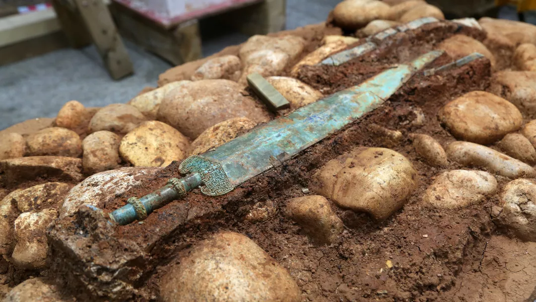 與渾圓箭鏃形成鮮明對比的青銅短劍,劍身厚重、兩刃鋒利,應該是一把實用兵器。兩千多年的掩埋,也未能抹去劍刃的寒氣。
