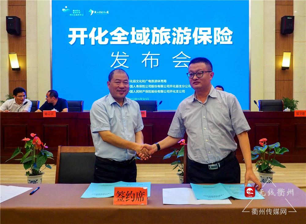 發布會上,開化縣文廣旅局局長金樹明與中國人壽保險股份有限公司開化縣支分公司、中國人民財產保險股份有限公司開化支公司簽訂了《開化縣全域旅游人身意外傷害保險合作協議》、《開化全域旅游游客人身意外傷害保險合同》。這意味著,全域旅游保險將正式在開化實施。
