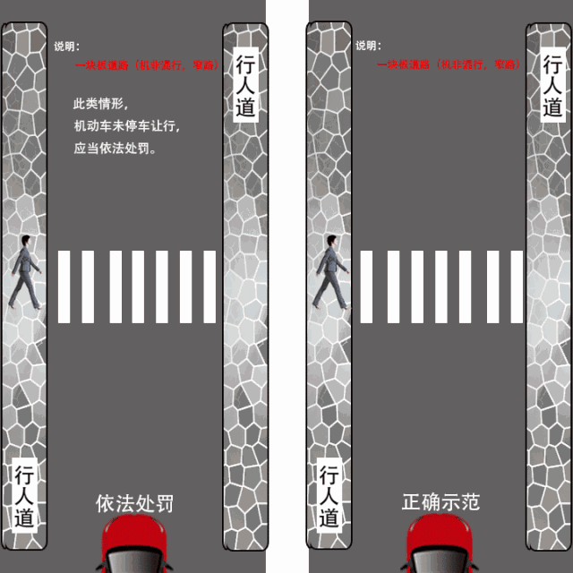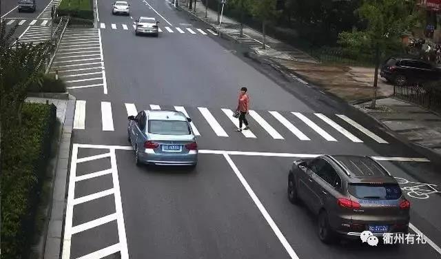 提醒:開車經過斑馬線要提前減速,隨時做好停車讓行的準備。行人剛踏入斑馬線,第②③車道車輛必須讓行,行人往前走,所在車道和下一車道車輛必須讓行。