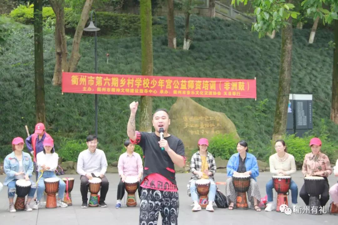 5月28日上午,衢州有禮“相同關愛·關愛鄉童”鄉村學校少年宮公益師資培訓在府山公園舉行。本次培訓的課程是非洲鼓,由專業的打擊樂老師老師執教,來自各縣(市、區)的20多所鄉村學校少年宮的近40余名老師參加。