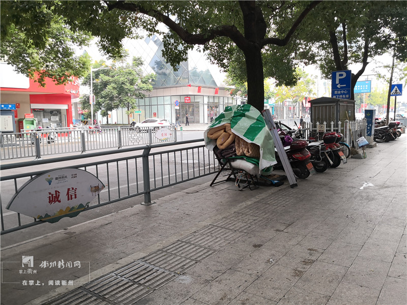在南街華夏銀行對面的人行道大樹旁,一張椅子上堆著幾條被褥,上面蓋著綠色塑料物,旁邊倚著一梯子。