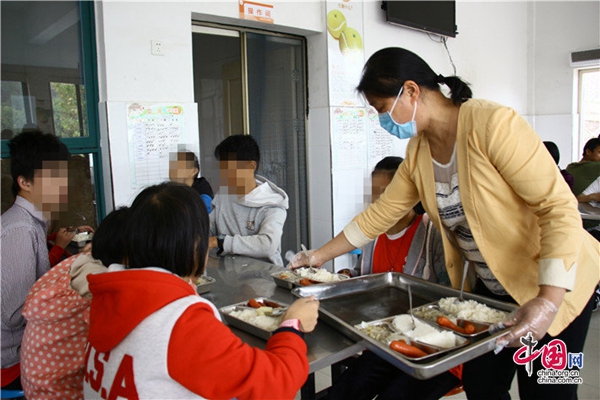 臨近飯點,黨員志愿者們還來到學校食堂,幫助食堂阿姨端著可口的飯菜給培智學校的孩子們,一盆盆飯菜在志愿者們的手中溫暖的傳遞著,孩子們一邊吃著香味撲鼻的飯菜,一邊看著志愿者們的愛心行動,臉上的笑容不時地洋溢著。
