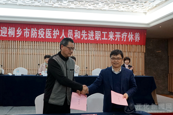儀式上,開化縣和桐鄉市本著“優勢互補、資源共享、互惠互贏、共同發展”的原則,簽訂兩地療休養合作協議。根據協議,雙方將進一步加強日常工作的學習和交流,設立聯絡溝通渠道,并在職工療休養方面最大程度地給予對方便利,實現工作互助、客源互送、產品互惠、成果互享。