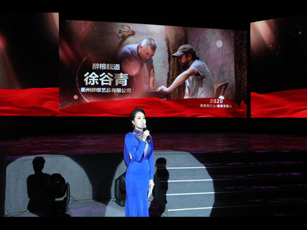 為充分展示新時代浙江省廣大文化和旅游工作者凝心聚力、共謀發展、積極服務“重要窗口”建設的精神風貌,在全社會樹立正確鮮明的價值導向,大力倡導學習最美、崇尚最美、爭當最美的風尚,12月15日,由中共浙江省委宣傳部、省文化和旅游廳聯合主辦的2020年浙江省首屆“最美浙江人·最美文旅人”發布會在浙江音樂廳舉行。發布會上,衢州醉根藝品有限公司董事長徐谷青榮獲“最美浙江人·最美文旅人”稱號。