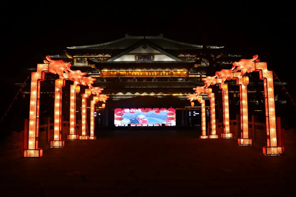 與之呼應的兩排高3.5米華夏鎏光,汲取了傳統風韻,以龍頭為設計元素,呈現出大唐盛世的華貴氣質,傳遞出新春祥和的氛圍。