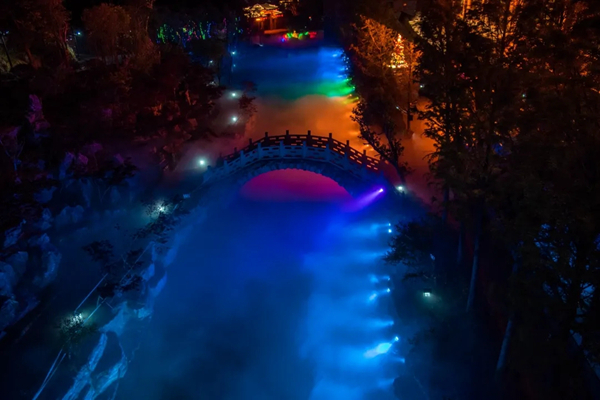 除此之外,在古戲臺、童趣園、歷史文化長河沿岸及小徑上,總有幾組或活潑、或可愛、或古韻悠然的燈組散發出五色光,映襯著湖面上光與霧織就的3D七色光。輝映著暖暖燈光的飛檐斗拱,舞臺上精彩絕倫表演,把整個根宮夜宴推向高潮。