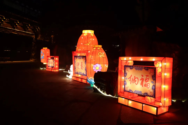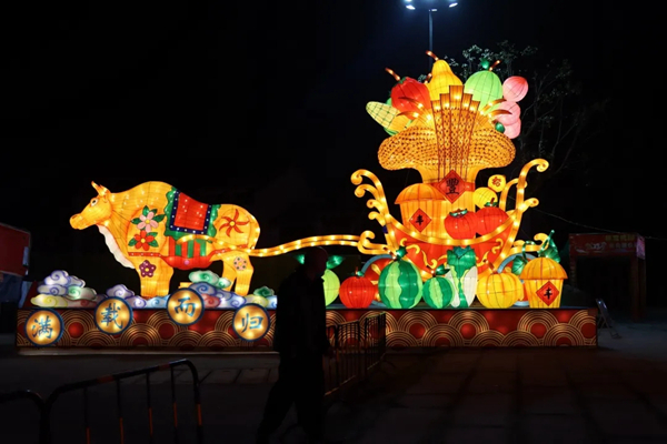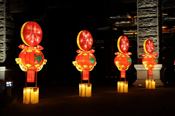 一路前行,醉根廣場入口,一排以傳統元素“牛年大吉”“恭賀新春”的宮燈,流光溢彩。