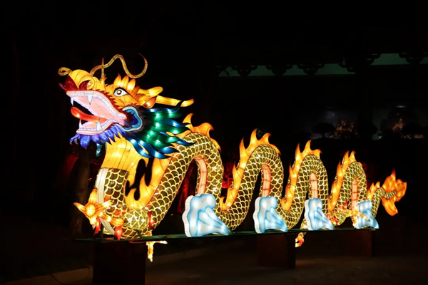 順著郁金香一路延伸的點點星火,華夏文化根雕藝術博物館廣場上的龍鳳呈祥、盛世太平兩組組燈,以磅礴之勢向我們撲面而來。