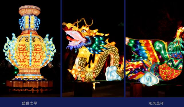 龍鳳呈祥燈組長15米,紋飾華美尊貴。高8米的盛世太平,形似“寶瓶”,以蒼龍鱗點綴,以孔雀紋裝飾,與一左一右的龍鳳相得益彰,有著龍鳳呈祥,盛世太平的吉祥寓意。