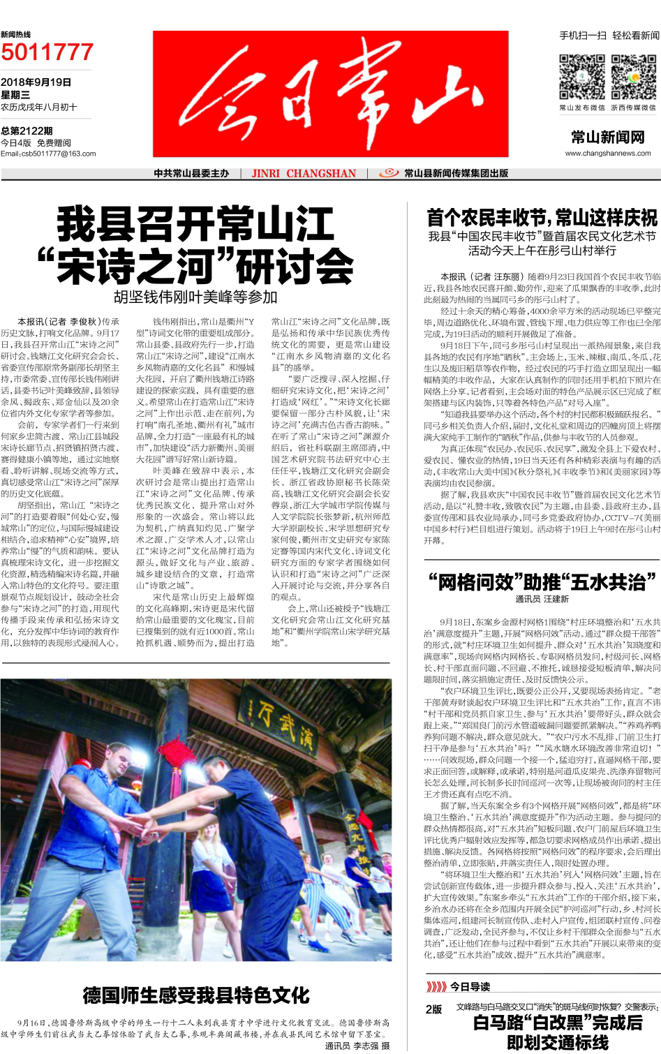 錢偉剛指出,常山是衢州“Y型”詩詞文化帶的重要組成部分。常山縣委、縣政府先行一步,打造常山江“宋詩之河”,建設“江南水鄉風物清嘉的文化名縣”和慢城大花園,開啟了衢州錢塘江詩路建設的探索實踐,具有重要的意義。希望常山在打造常山江“宋詩之河”上作出示范、走在前列,為打響“南孔圣地、衢州有禮”城市品牌,全力打造“一座最有禮的城市”,加快建設“活力新衢州、美麗大花園”譜寫好常山新詩篇。(李俊秋)