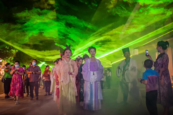 活動現場,燈光璀璨、人潮涌動。在熱烈的氛圍中,濃郁的宋韻文化隨著音樂與燈光逐漸舒展開來,一曲歌伴舞《千年宋詩河》拉開了市集活動的帷幕。