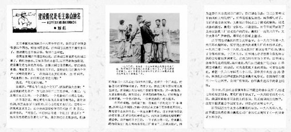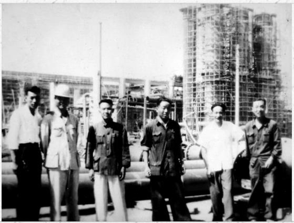 (1958年7月,衢化赴蘭化培訓的楊在浩(右3)、田寶德(左3)、朱文斌(右2)、朱爾泉(左2)和詹望(右1)在蘭化工地上的合影。 )