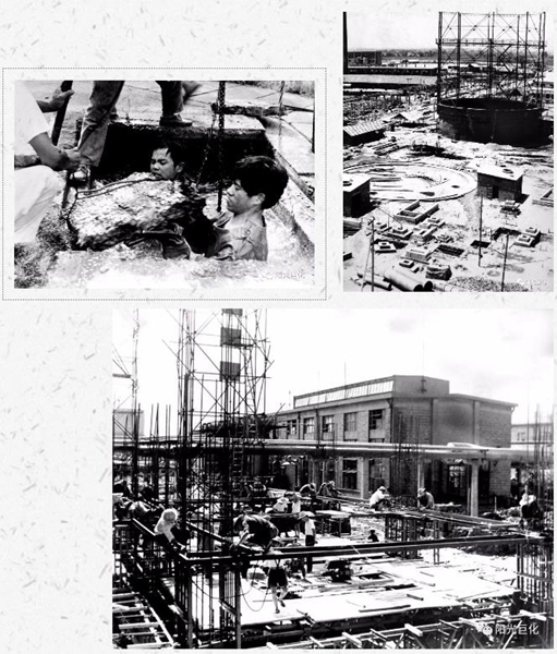 在當時建筑材料供應不足的情況下,巨化一代創業者自力更生解決困難。沒有毛竹和木料,自己上山砍;沒有水泥,就用土法自制水泥;沒有磚頭,就地取材自己動手做……由于建設人員大批進場,吃、住都很困難,為了節約工程費用,大家提出了“苦戰三個月,節約三十萬”的口號。沒有電燈,沒有自來水,住更是僅有一卷鋪蓋,就是在這樣的艱苦條件下,大家仍然精神抖擻、喜笑顏開,“為了建設化工廠,生活艱苦也高興”。