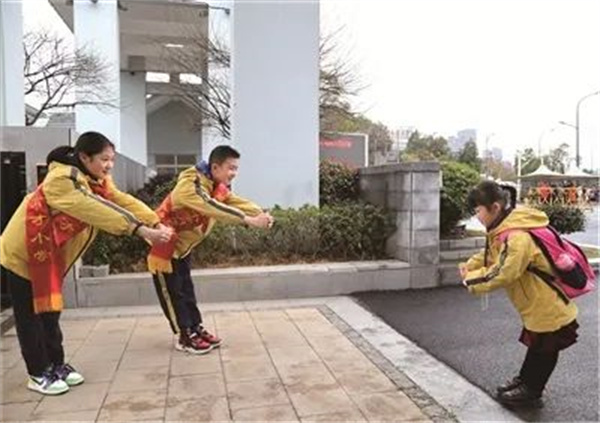在常山縣育才小學,行作揖禮已成為全體師生的日常習慣。推廣作揖禮是該?!耙恢芤粌x”德育品牌建設的重要內容。清晨,值日老師站在校門口迎接孩子,學生躬身作揖,向老師“問早”;每逢國旗下講話,學校邀請各班級的禮儀生現場講解和教學如何行作揖禮,對不標準的作揖禮進行指導和修正,做到反復鞏固;學校安排學生參與校園衛生保潔,學生打掃衛生時遇到老師,會很自然地放下垃圾、掃把向老師行作揖禮,老師也及時回禮;下午放學時,師生間、學生間用作揖禮互相道別。育才小學辦公室主任胡箭慧說,不僅如此,學校還將禮儀納入畢業課程“十八般武藝”,只有合格了才可以頒發“十八般武藝闖關證書”。