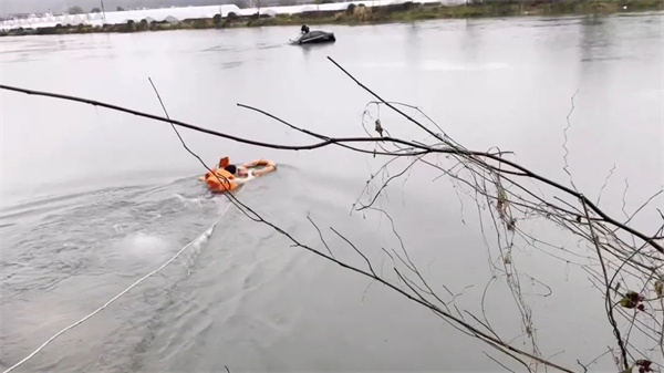 毛勤峰和吳旭快速跑到橋上,但此時鄭先生的車子卻開始在河中央打轉,并未按照設想的那樣移動?!皝聿患傲?,這樣下去車子進水會越來越多?!泵诜逭f。倆人又回到距離車子最近的岸邊,毛勤峰迅速脫掉警服,光著膀子穿上救生衣并系好救生繩,帶著救生衣和游泳圈縱身躍入水中,奮力向河中央游去。