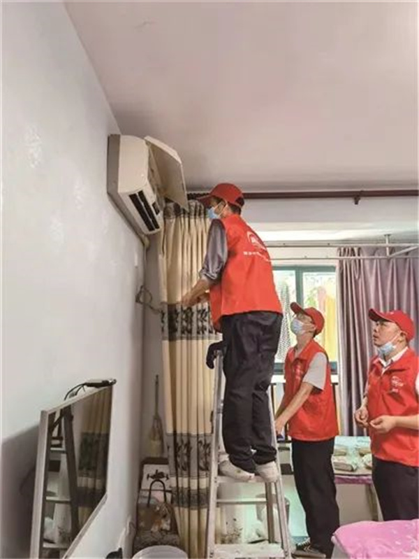 等接好清水,再給壁掛式空調周圍做好衛生防護,志愿者毛洪彪打開多功能清潔機,手持噴槍開始認真清洗。志愿者徐真仙則在另一邊的衛生間忙著清洗網葉和外蓋。因為當天目睹了數臺空調的清洗,一直在邊上扶梯子的80后志愿者余振興很快在“師傅”毛洪彪的指導下,掌握了這項新技能,開始分擔一部分清洗任務。天氣悶熱,忙碌中的志愿者一下就干出了一身汗。