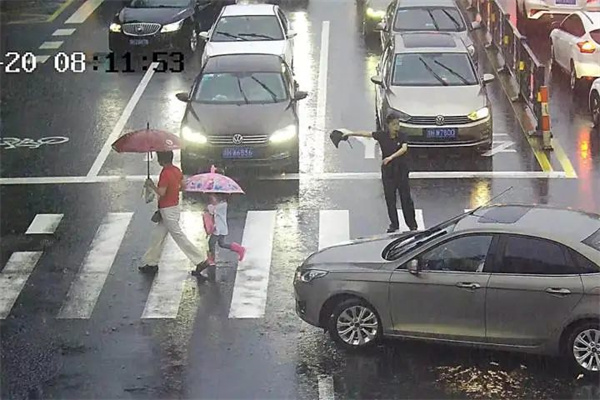6月20日7:40分左右,衢州常山大隊城區中隊輔警翁婷,在送小孩上學后返回的途中,發現渡口路與白馬路交叉口大面積堵塞。由于城區中隊的警力在各嚴重積水路段疏導交通、處理事故。一時無法迅速趕到翁婷所在路口指揮交通。翁婷向中隊匯報該路口狀況后,在沒有雨衣、雨鞋等裝備的情況下,立即上前指揮交通。