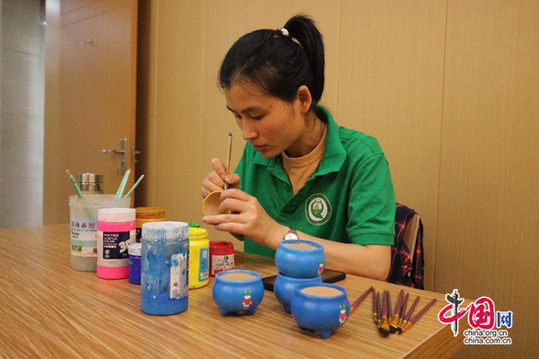 “我感覺陶繪很有意思,我是跟小鄭學習的,現在主要做陶盆上色工作?!备浇值罋埣踩酥业谋幼o對象梁先生說,“我現在在殘疾人之家主要做來料加工,然后也做陶盆,很有意思?!?/p>