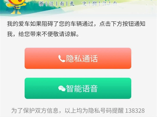 “行有禮”挪車貼上印有“文明規范停車爭做有禮市民”幾個字和一個二維碼。車主只需先行掃描二維碼,將車牌信息與手機號綁定,便可激活挪車小程序。掃描“行有禮”挪車貼后,頁面顯示“隱私通話”和“智能語音”兩個選項。當需要車主挪車時,可以直接撥打加密后的車主號碼提醒其挪車,方便快捷的同時,也保護了車主的隱私。