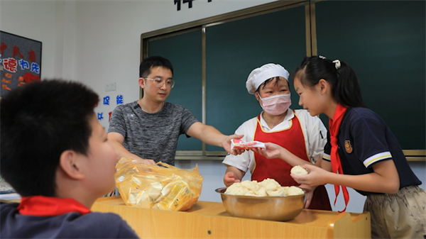 “同學們,你們的下午茶時間到了,快去洗洗手,回來吃包子吧?!毕挛?點,學校食堂工作人員將新鮮出爐的熱包子和酸奶送到六年級(4)班教室里,35名學生開心地享用著這份畢業季加油“下午茶”。