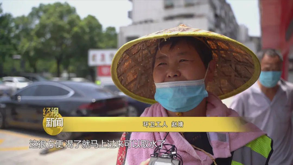 環衛工人趙婧說,我就在前面(工作),這很方便,渴了就馬上過來可以取水了。