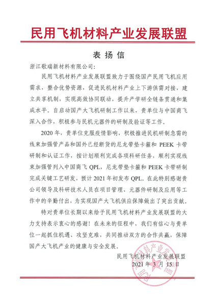 2020年,受新冠肺炎疫情影響,中國商飛多個航空用非金屬材料標準件及緊固件面臨斷供風險,急需在國內尋找該產品的國產化替代方案。受中國商飛委托,歌瑞公司克服疫情影響,積極組織技術力量推進航空氟塑料制品開發,先后完成航空用PTFE(聚四氟乙烯)板材及原型材產品、尼龍帶墊卡箍等產品開發研制認證工作。為此,民用飛機材料產業發展聯盟專門發來表揚信,對歌瑞公司與中國商飛深入合作,積極參與民機元器件的研制及驗證等工作給予高度評價,對歌瑞公司在實現國產大飛機供應保障中做出的突出貢獻表示衷心感謝。