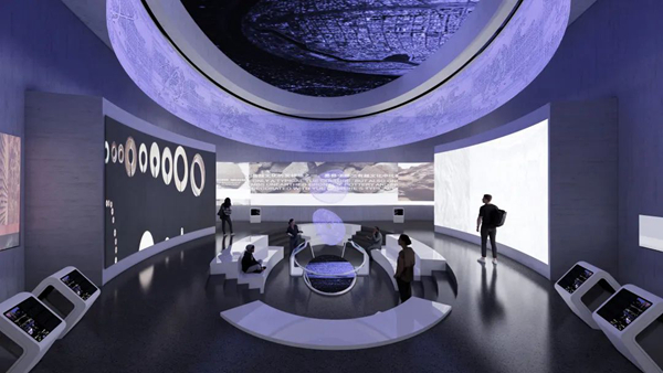 中央大廳采用粗糙肌理的夯土墻體模擬遺址氛圍,頂部利用光電玻璃或激光投影根據展陳需要模擬浩渺的星空。