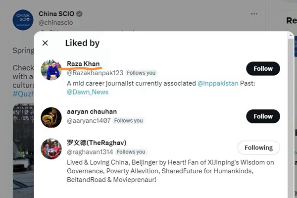 除了引發官方賬號的關注,巴基斯坦著名新聞機構獨立新聞社記者Raza Khan推特賬號點贊了國新辦的這條推文。Raza Khan在海外社交平臺上經常傳播中華文化,他賬號的推文常有較高的互動和點贊量。