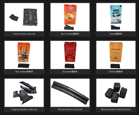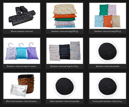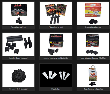 Hookah charcoal, Mouth tips, Incense charcoal, BBQ charcoal briquettes, Wood sawdust charcoal, Bamboo charcoal, Microned bamboo charcoal powder, Nano bamboo charcoal powder, Food grade Bamboo carbon black ( for bakery usage, etc), Bamboo vinegar, etc.