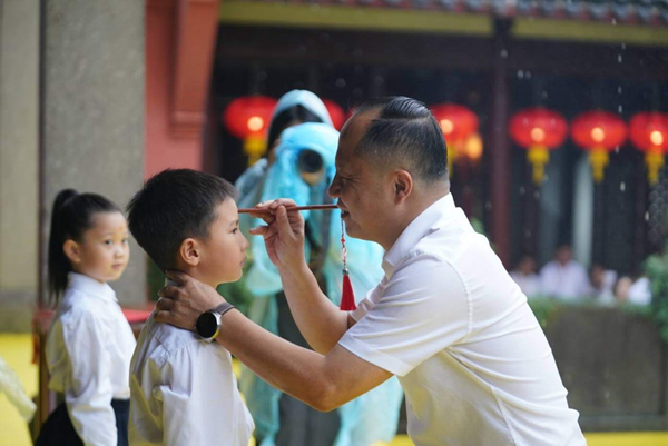 “學而時習之,不亦說乎。有朋自遠方來,不亦樂乎……”日前,伴隨著《論語》誦讀聲,2023“南孔圣地·崇賢有禮”開蒙禮舉行。正衣冠、互正衣冠、師正衣冠,隨后老師、嘉賓給孩子的額頭點朱砂。設在孔氏南宗家廟大成殿前的主會場,148名一年級新生代表參加儀式,全市207所小學設分會場,2737名一年級新生集體“開蒙”。
