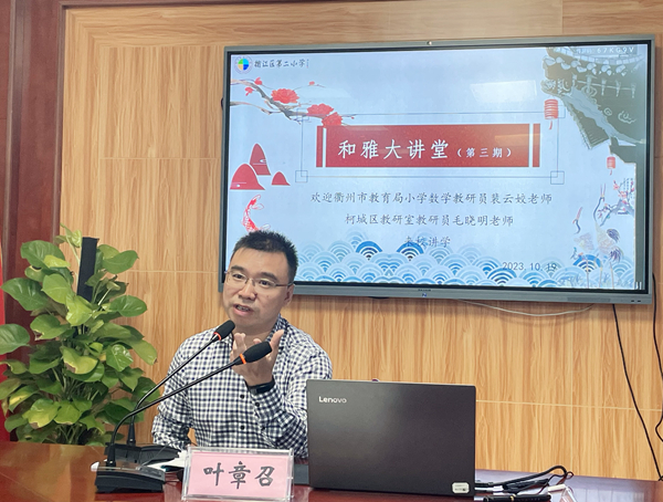 “求木之長者,必固其根本。欲流之遠者,必浚其泉源?!睘檫M一步提升教共體教師的教科研水平,指導教師如何進行課程設計與開發,加速教師的專業成長速度,近日,衢江二小教共體邀請衢州市教育局小學數學教研員、義務教育精品課程專家裴云姣和柯城區教研室教科研專家毛曉明老師來校講學。衢江二小教共體成員學校部分教師、二小“和雅新秀培養班”學員、二小全體數學教師、學校教科研骨干以及裴云姣名師工作室成員齊聚一堂,聆聽這場教科研的盛宴。
