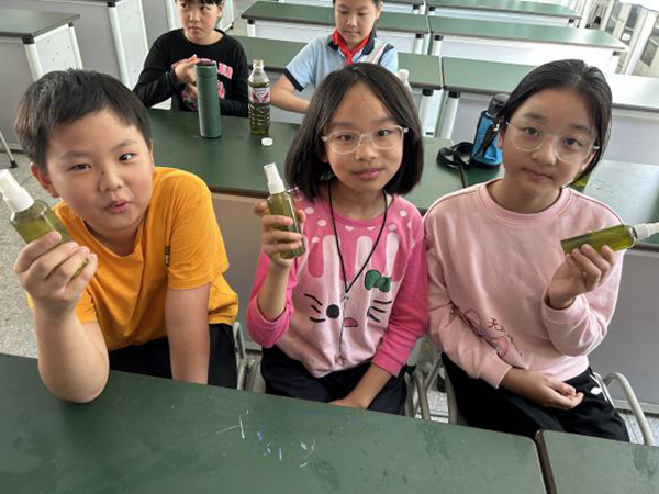 孩子們自己親自采摘的薄荷葉、艾草和金銀花,經過清洗、晾曬、挑選、按比例混合后加入酒精靜置,最后稀釋成花露水。