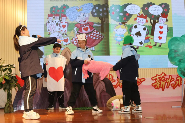 英語姜玲敏老師帶來閱讀劇演新課堂第一節《經典演繹:Alice inwonderland》。這節課是中山英語節“語”播地球村的后續,英語組在寒假推薦學生閱讀繪本《Alice in wonderland》.開學第一課閱讀劇本展示課時,同學們根據自己的喜好,進行分組準備,制定計劃書,演繹經典劇段,并根據評價量表評選出最佳人氣獎和最佳合作獎。通過表演,同學們更是信心滿滿,對英語學習有了更大的熱情。