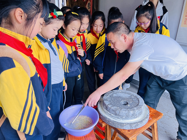 同學們合作磨豆漿,大大的石磨在孩子們的手上是沉重的,但孩子們的臉上都洋溢著快樂,一勺水,一勺豆子,一圈一圈,磨出了美味......你瞧,親手磨的豆漿就誕生了。