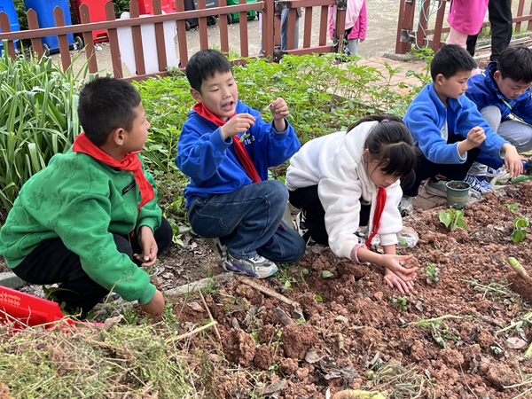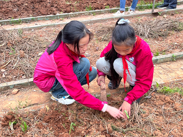在書記“‘壟藤草堂’開園啦!”的話音下,校園里也傳出了陣陣歡呼。同學們紛紛拿起農具走進“壟藤草堂”,興致勃勃地整理土地,大家小組合作,鋤地、挖坑、播種、澆灌……做得有模有樣,不怕臟、不怕累,個個干勁十足。西紅柿苗、小辣椒苗、甘蔗苗、四季豆苗……一顆顆小苗伴隨著一張張笑臉,為校園增添了新的希望和活力。