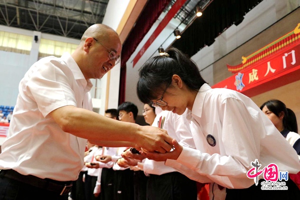 “巍巍中華,煌煌盛世;民族復興,我輩擔當。十八而誓,自立自強;為國為家,當仁不讓。敦品以修身,勵學強本領;成人更成才,不負師長恩。學成文武藝,報國志永存;今日共勉勵,同學須發奮。龍騰萬里遠,鳳翔九霄云;天道本酬勤,前程當似錦!”最后,全場學生面向國旗宣誓,表達心中志向,并與家長共走成人門。