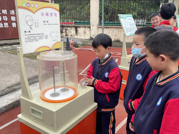 在“尖端放電”展品前,孩子們轉動旋鈕,當金屬尖端靠近時,發生了放電現象?!盀槭裁捶烹姮F象發生在金屬的尖端呢?”“是不是哪里通電了?”“為什么有的地方沒有放電?”……親身體驗的過程中,孩子們興奮地討論了起來。為幫助學生們更好地理解這個知識點,老師們用通俗易懂的語言,剖析現象的原理:“導體表面的電荷密度與形狀有關,凹的部分電荷密度接近零,尖銳處電荷密度最大,電場特別強……”在輕松、歡樂的互動體驗中,這場科普活動幫助孩子們揭開科學的神秘面紗,讓課本里的知識“活”起來。