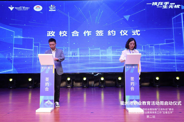 姜文軍在致辭時介紹,近年來,衢江區緊盯地方社會發展需求,以衢州理工學校為主要載體,深化產教融合、數字變革、社會服務等關鍵環節,實現職業教育與產業發展和城市建設的同頻共振、互融共生,為新型城鎮化注入了更多教育力量。近三年,衢江區中職學生頂崗實習本地率由85.6%上升至96.9%,畢業生就業率超過98%,年培訓社會各行業人員超5000人次,職業教育集團入選國家級示范性職業教育集團培育單位。