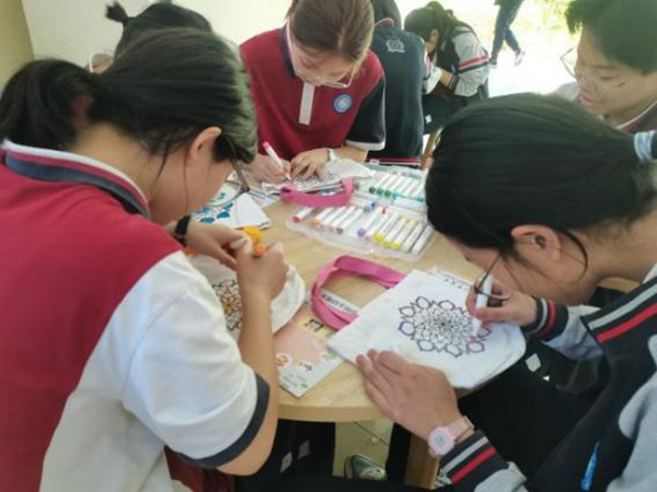 為了帶領學生去覺察自身,我們開展了面向全校學生的心情日歷打卡活動,邀請學生將兩周的心情用自己喜歡的方式記錄下來,幫助他們覺察自身情緒的發展脈絡,能夠及時幫助自己調整好狀態,積極面對生活。學校以幫助學生面對自身,更加全面來認識自己,正視自己的情緒狀況為重要切入點,開展了曼陀羅DIY手袋活動,讓學生在這個古老而又神秘的曼陀羅符號中,一筆一劃認真地用五彩斑斕的畫筆進行涂色,與自我進行對話,讓心靈得到寧靜。
