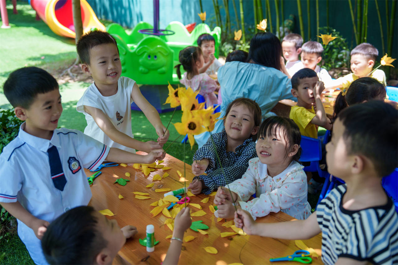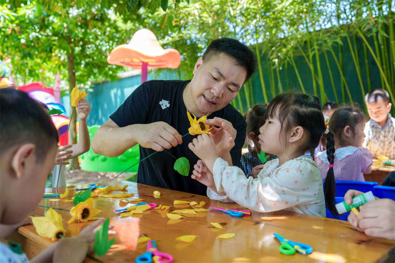 “剪花瓣、粘花瓣的時候一定要細心、耐心,不能著急?!闭n堂上,鄭老師一邊示范,一邊講解向日葵的花語:是沉默的愛,對應了父親在生活中對孩子無言的愛意。一朵小小的向日葵給孩子們帶來了一個活靈活現的世界,孩子們雖然年紀小,但也在努力做得更好。